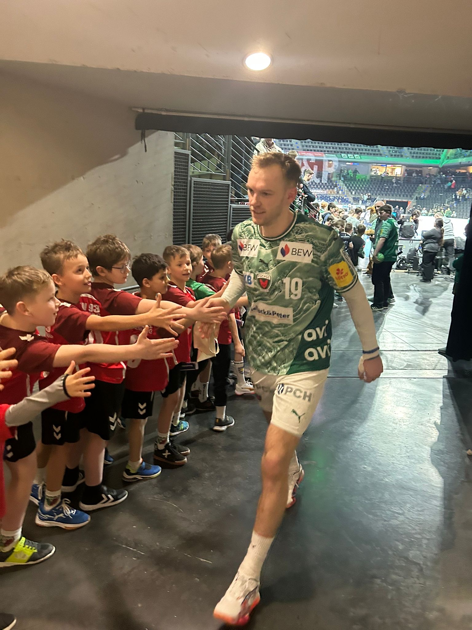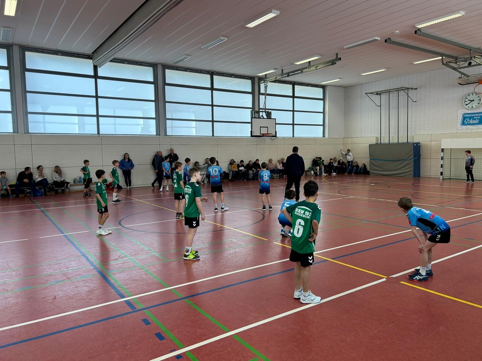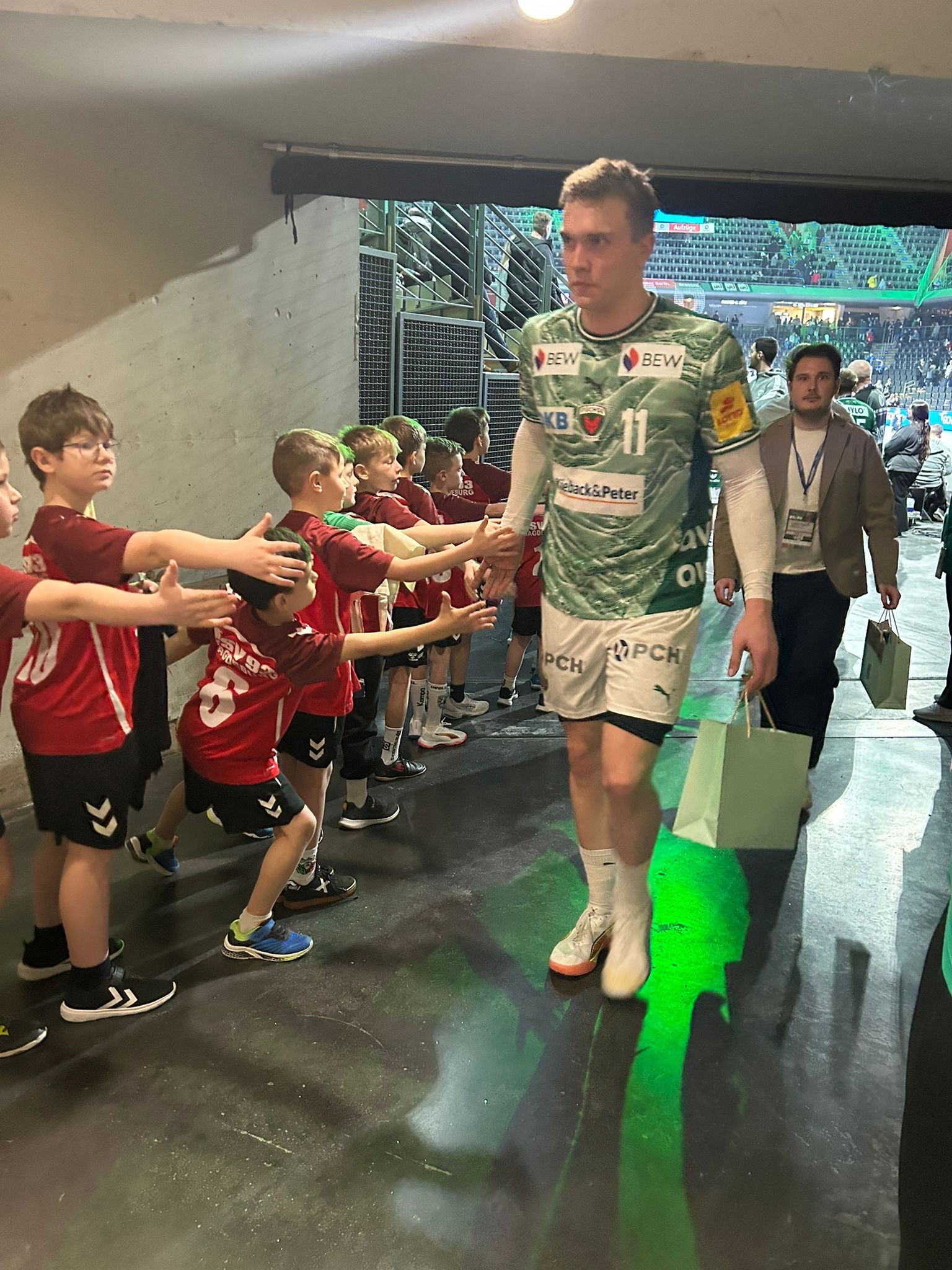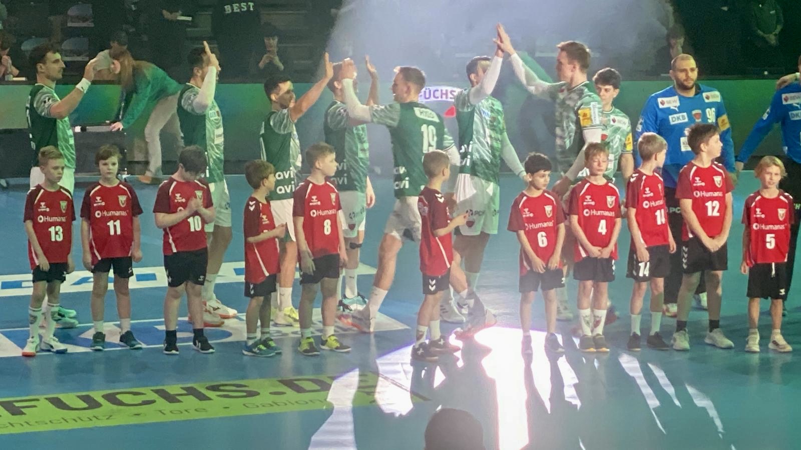 Nach einem gemeinsamen Mittagessen begab sich der Tross aus fast 50 Eltern und Kindern in Richtung Max-Schmeling-Halle, wo wir als Einlaufkinder die Stars der Füchse Berlin gegen den TVB Stuttgart auf das Spielfeld begleiten durften. Hand in Hand mit Gidsel & Co in die mit 9.000 Zuschauern gefüllte Arena einlaufen - Ein Highlight für unsere Jüngsten. Selbst der Hallensprecher und Füchse-Chef Bob Hanning zeigten sich etwas irritiert, dass Magdeburger Kinder im Fuchsbau einliefen ;). Direkt hinter der Auswechselbank durften wir den 37:32 Sieg der Füchse beobachten und ganz nah dran sein.